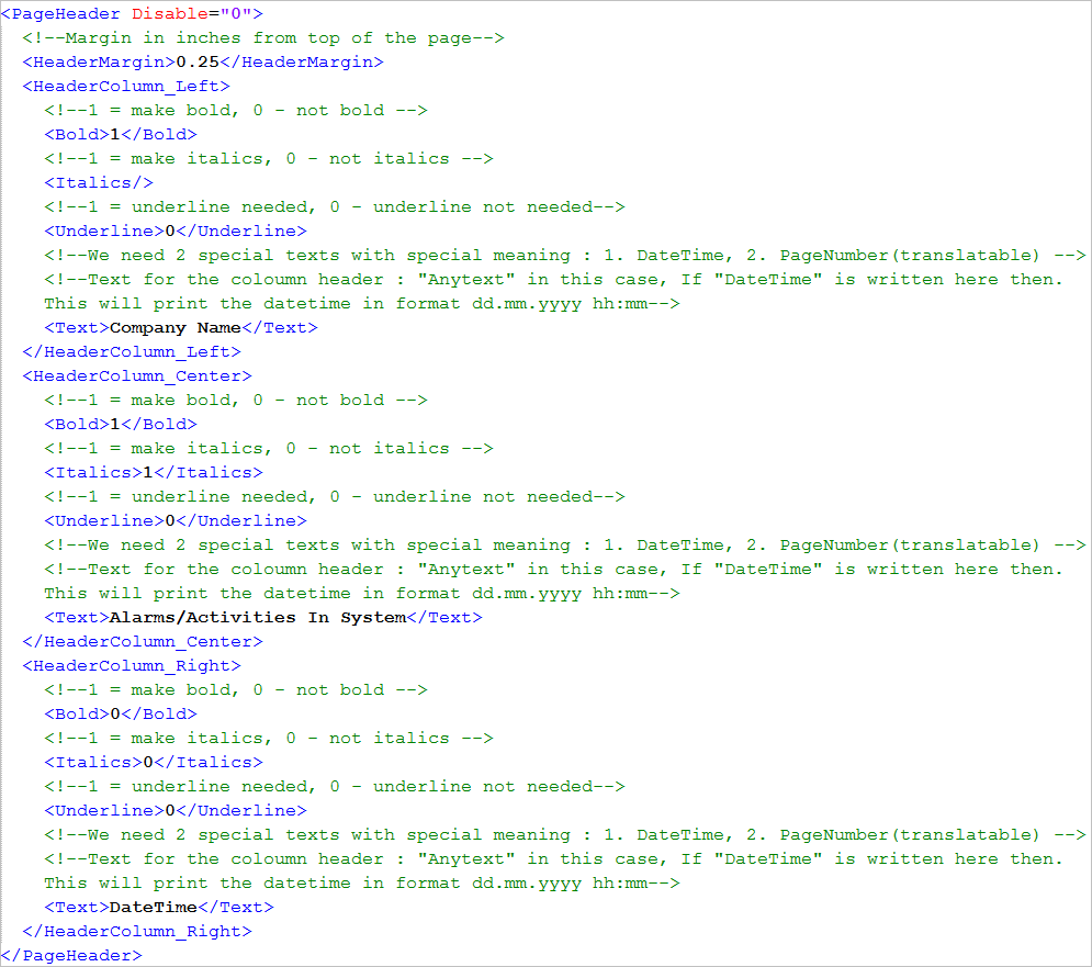- Repeat steps 2 to 5 to set the text and their corresponding formatting options for the center and right header columns using the <HeaderColumn_Center> and <HeaderColumn_Right> tags respectively.