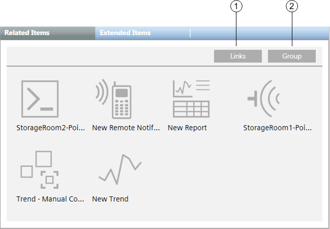 2 | Group/Ungroup buttons | If text links are displayed, clicking the Group button displays text links by categories such as analog inputs, analog outputs, schedules, reports, PDFs, Word files, and Web links. If icons are displayed, clicking the Group button displays icon links by categories. |