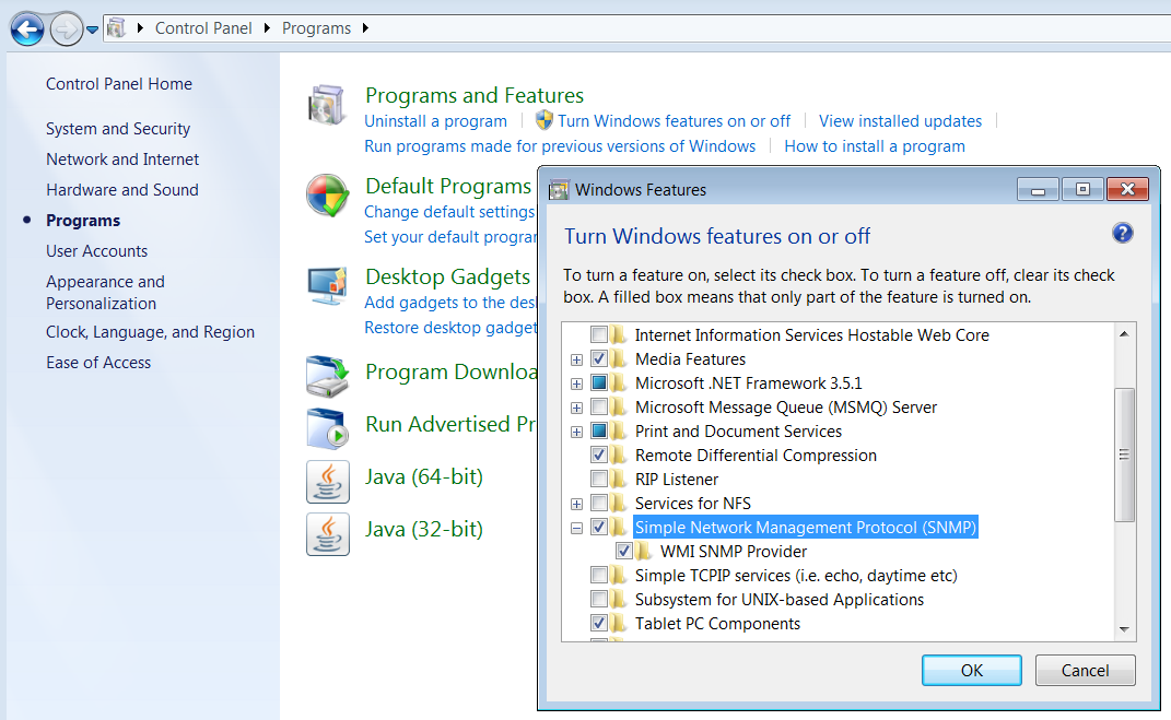 In the list that displays, locate and select the Simple Network Management Protocol (SNMP) check box as well as the related sub-nodes. Then, click OK.