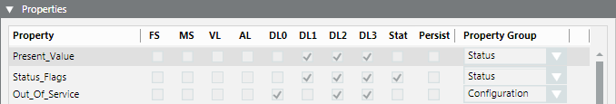 For object properties with read and write access, assignment for the Property Group display level and Command Group commanding are made per the definitions in the following tables.