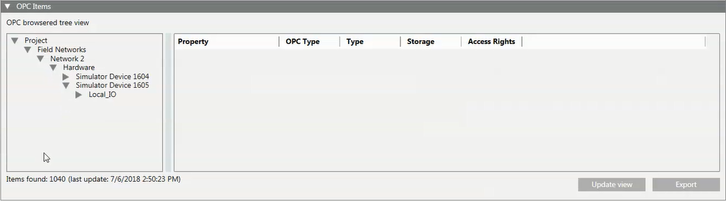- (Optional) In the OPC Items expander, click Update view to refresh the Desigo CC OPC server configuration data.