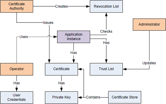 A certificate is an electronic ID that can be held by an application. The ID includes information that identifies the holder, the issuer, and a unique key that is used to create and verify digital signatures. The syntax of these certificates conforms to the X.509 specification, and these certificates are also known as X.509 Certificates. The certificates also have an associated private key.