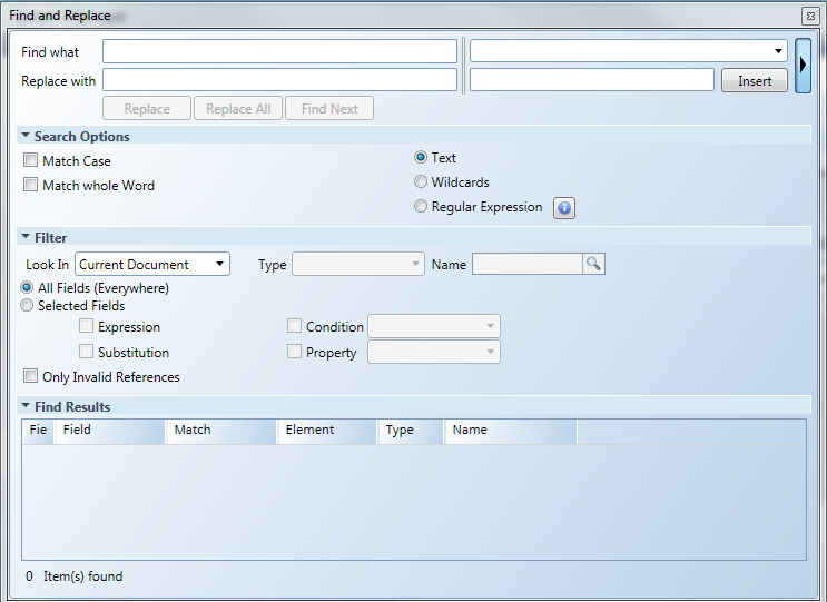 Replace | If nothing is selected in the Find Result pane, the first item is replaced and a Find Next is performed. If one or more items are selected in the Find Result pane, all selected items are replaced and then a Find Next is performed. |