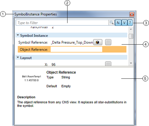 1 | Title Bar | Display the name of the currently selected element on the active graphic. The title bar text changes to reflect the name of the active element whose properties display in the Property view list area. |