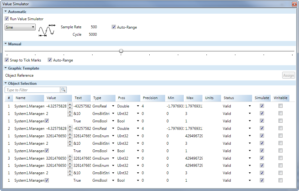 Writable | Use the manual slider and simulator to write values down to the system (for example, to a field device). NOTE: The Value field is not affected by this check box. This check box is not checked by default. |
