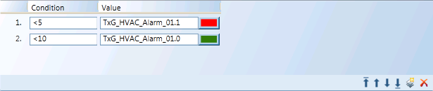 For example, if you open the Text Group, HVAC_Alarm_01 in the Text Group Editor, you see that it has two states defined, Normal and Alarm. Each state has the Value associated with it, as well as the assigned Color and an Icon.