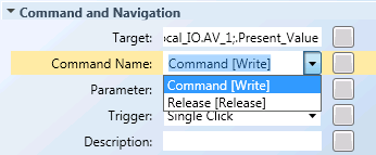 After dragging a property form the Extended Operations tab or System Browser to the Target property in the Command and Navigation property tab in the Graphics Editor, the drop-down is filled with commands that have been defined in the library for that object model. The commands are then displayed in the format: Label[Name].