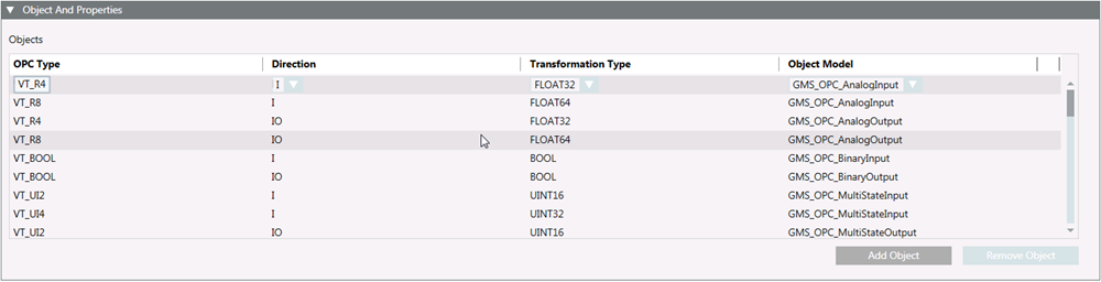 The Objects and Properties expander lets you map OPC types and OPC object models: It also lets you define transformation type and the direction of communication for a field point of an object model.