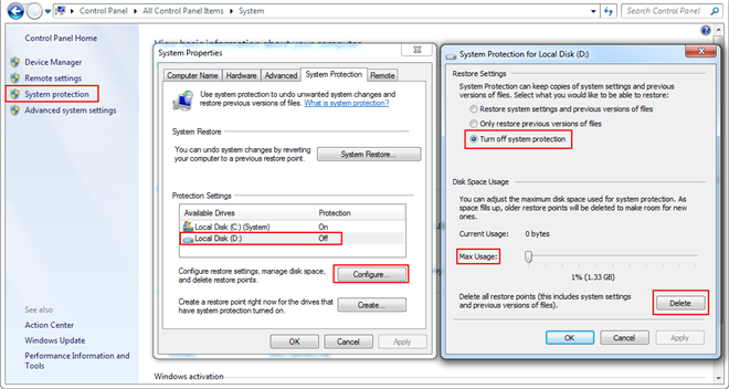 - Select Turn off system Protection.
