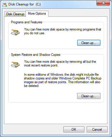 - Select the More Options tab and perform a Cleanup to clean files from all users on the computer to free even more disk space.