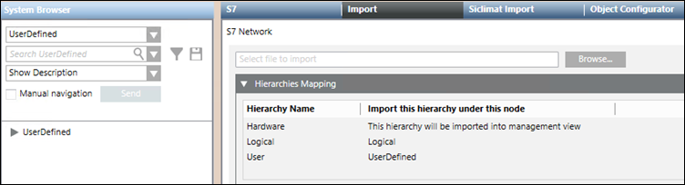 - In the Siclimat Import tab, open the Hierarchies Mapping expander, and define the destination in the optional views (logical view and User View) of the data structures (hierarchies).