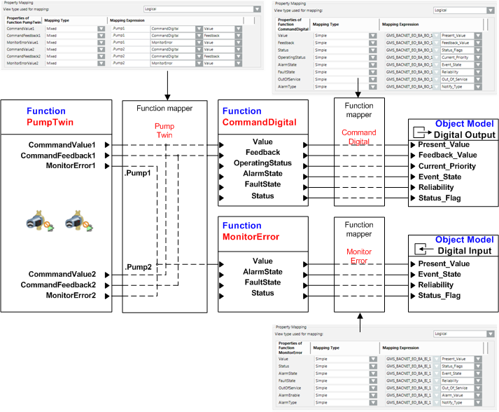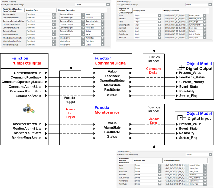 As part of Functional Mapping, which is independent of the subsystem, several Functions are required for object display and operation. This requires that the logical mapping in the system be hierarchical. For example, a pump with digital I/O.