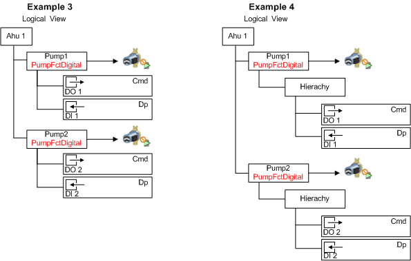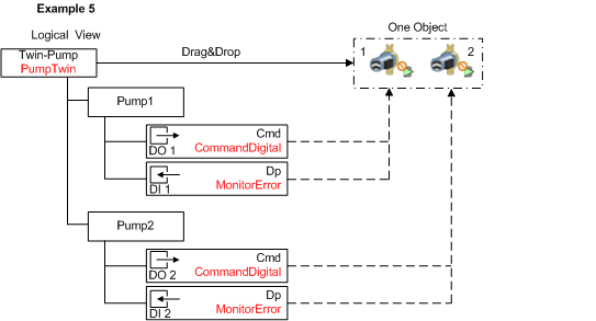 Example 5 shows Pump1 and Pump2 with additionally engineered hierarchy object below the PumpTwin Function. Each hierarchy object has a subordinate CommandDigital and MonitorError Function for its functionality. Making the hierarchical objects .Pump1 and Pump.2 part of the TwinPump Function results in unique individual object information.