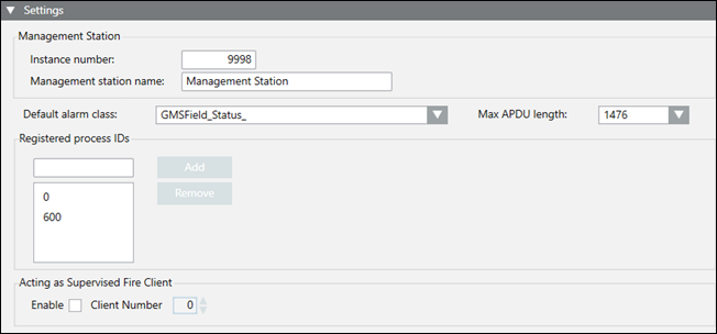 Registered process IDs | Used to filter alarms received by the management station. The defaults are 0 and 600. If you are integrating with a third-party vendor, consult with them to discover the Process IDs for their devices, and then add them if necessary. |