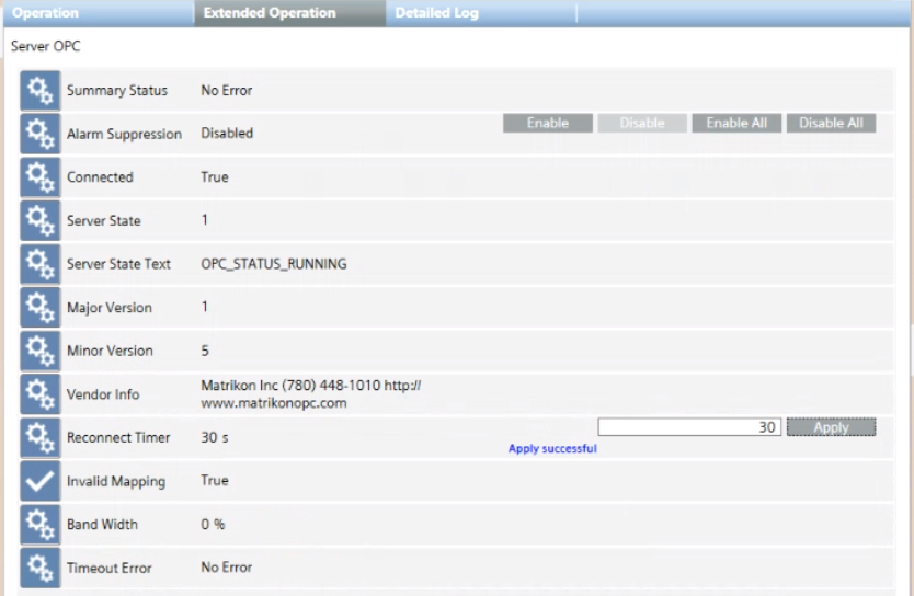 When you select an OPC server, the Extended Operation tab displays its properties and commands.