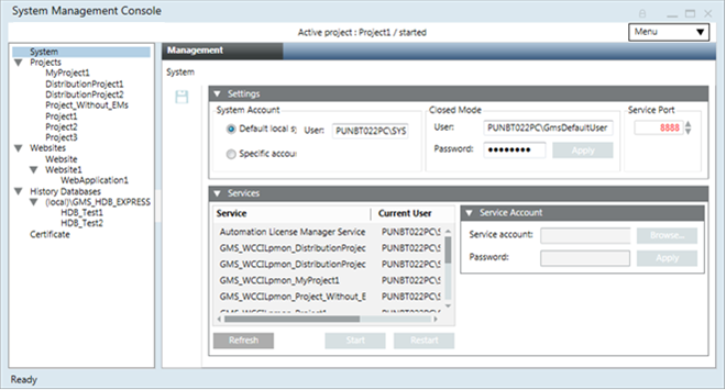 - From the Services expander, you can change the Service account user of a listed service except the project's Pmon service, GMS_WCCILpmon_[Project Name]. When needed, the Pmon service GMS_WCCILpmon_[Project Name], Service account user can be changed using System Accounts of the Settings expander.