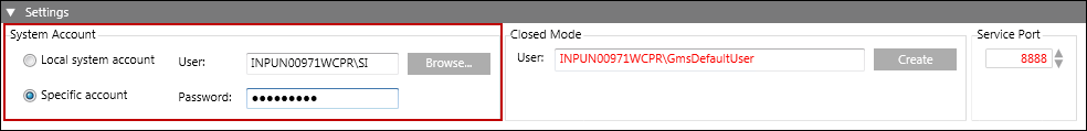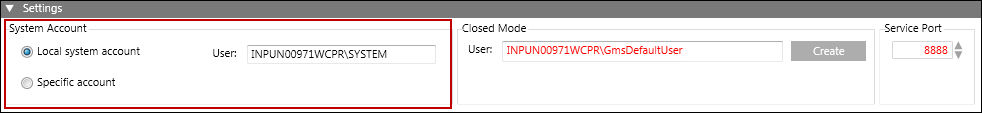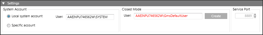The Settings expander allows you to specify settings for System Accounts, Closed Mode and Service Port (only on Server).