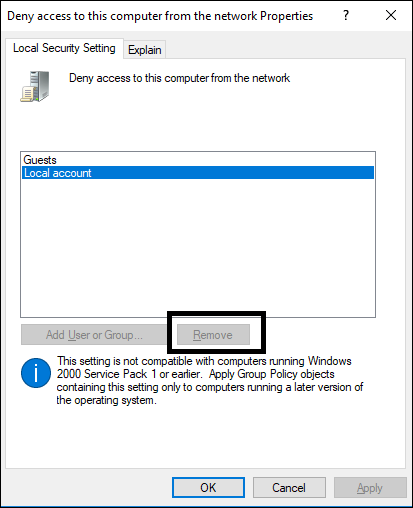 - Open initial.cfg in an editor such as Notepad and locate SeDenyNetworkLogonRight.