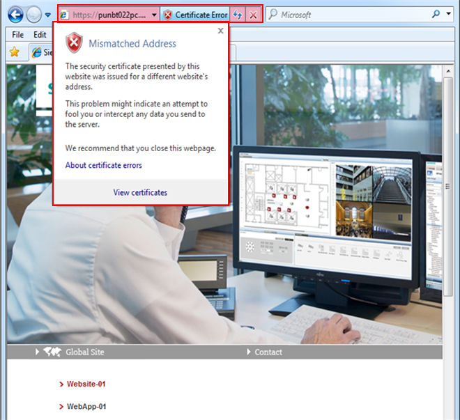 and save the third-party website. However, if you still cannot launch the Desigo CC web page, see Cannot Launch the System Web Page with HTTP 500 Internal Server Error. - Make sure you use the proper URL for the server. The URL is https://[Host name]:[HTTPS port number]/[Web application name].