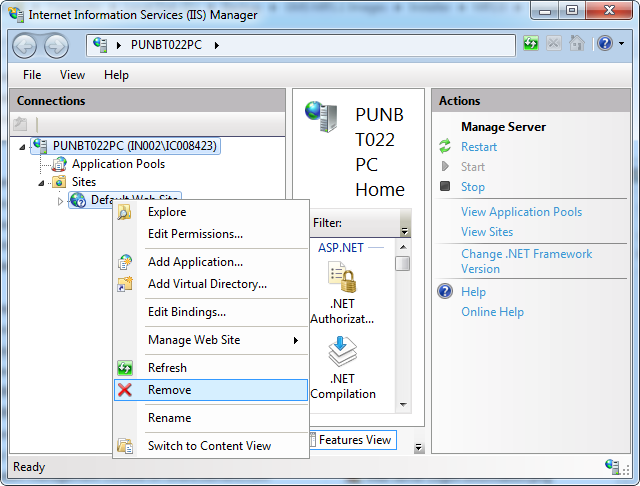 - In the Connections pane of the IIS Manager window, select the root node (http://local host/) and click Restart in the Actions pane to restart IIS.