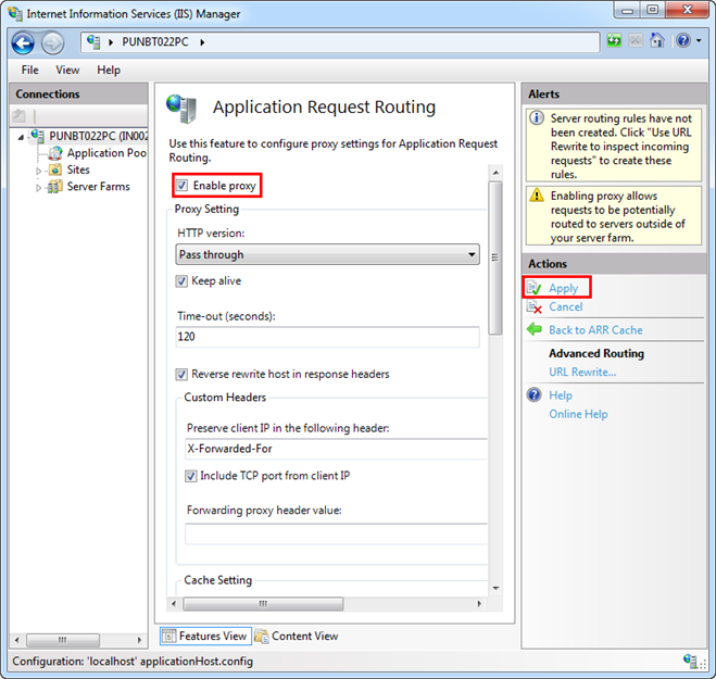 - In the IIS Manager window, verify if Application Request Routing Cache is present. Otherwise, re-run the Gms.InstallerSetup.exe file that installs the prerequisite ARR.