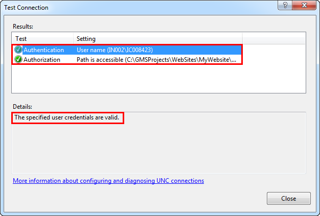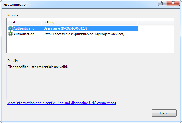- In the Test Connection dialog box, ensure that both results—Authentication and Authorization—are successful and the message