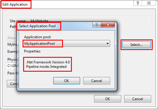- In the Select Application dialog box, ensure that the version of Application Pool: .Net Framework Version and Managed Pipeline Mode is the same as the application pool version on the source machine.