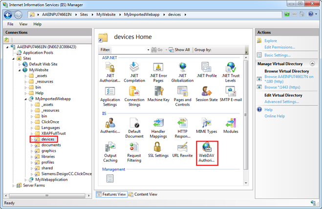- Select Sites > [website] > [web application] > [Virtual Directory] for which you want to enable the WebDAV Authoring Rules and double-click WebDAV Authoring Rules.