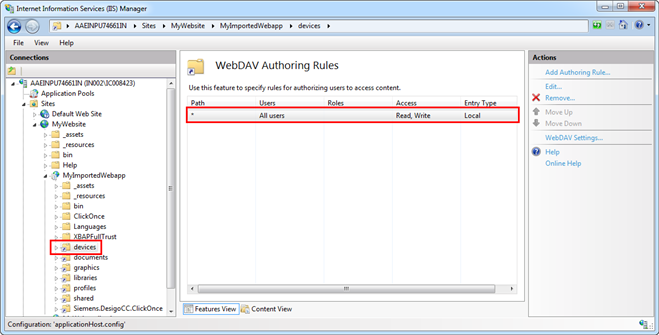 - Select Sites > [Website node] for which you want to enable the WebDAV Authoring Rules and double-click WebDAV Authoring Rules.