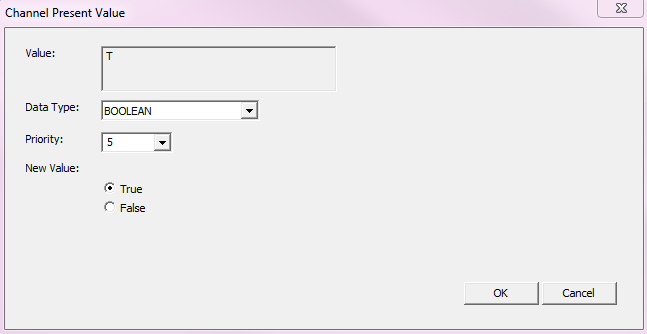 The Channel Present Value dialog box allows you to change the data type, priority, and value.