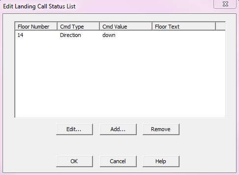 The Edit Landing Call Status List dialog box represents a list of landing calls for a group of lifts.