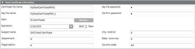 Path: Browse for the location to store the root certificate and the root key file on the disk. By default, the path of the last created root certificate is selected.