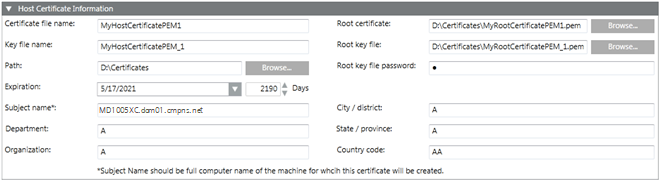 Enter the following information about the subject: — Subject name : By default, the Subject name field displays the full computer name of the machine (including the domain name, if the machine is in a domain), for example, ABCXY022PC.dom01.company.net. You can modify this to set the desired name. Remember that the host certificate's Subject name should not be same as the root certificate's Subject name. By default, the subject's identifier information (except for the Subject name) is filled with the last root certificate's subject's information. — Department — Organization — City / district — State / province — Country code (only two characters)