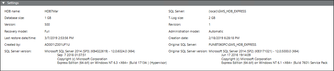 Original SQL Server version | Displays the original version of the SQL Server used to create the History Database. |