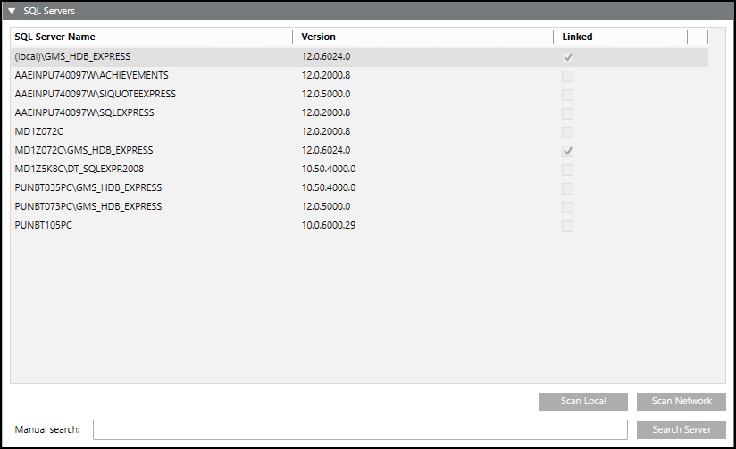 Manual Search | Text field to type server and instance names such as CH1W22332\GMS_HDB_EXPRESS. |