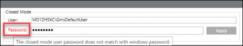 - In the Password field of the Closed Mode Settings, type the most recent password for the Closed mode user (GmsDefaultUser) that is set in Windows.