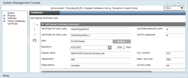 - In the Self-Signed Certificate Information expander, enter the details into the following fields: Certificate file name (.pfx) and (.cer) and the Password, and Path.