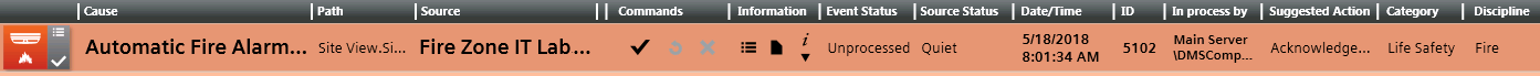 From the event descriptor, use the icons in the Commands column to send any commands as they become available. The commands you must send will vary depending on configuration. A typical sequence may include: