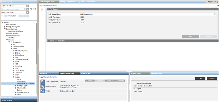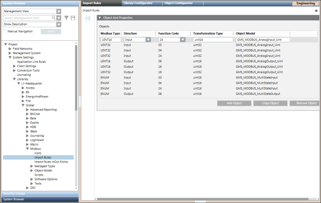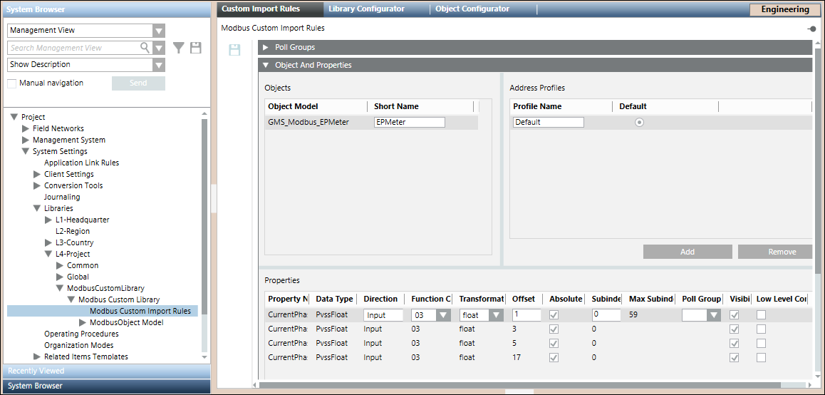 Import rules serve as mapping between the Engineering data and the Object Model configuration parameters in the management station. This requires creation of an instance of GMS_MODBUS_CustomRules in your library.