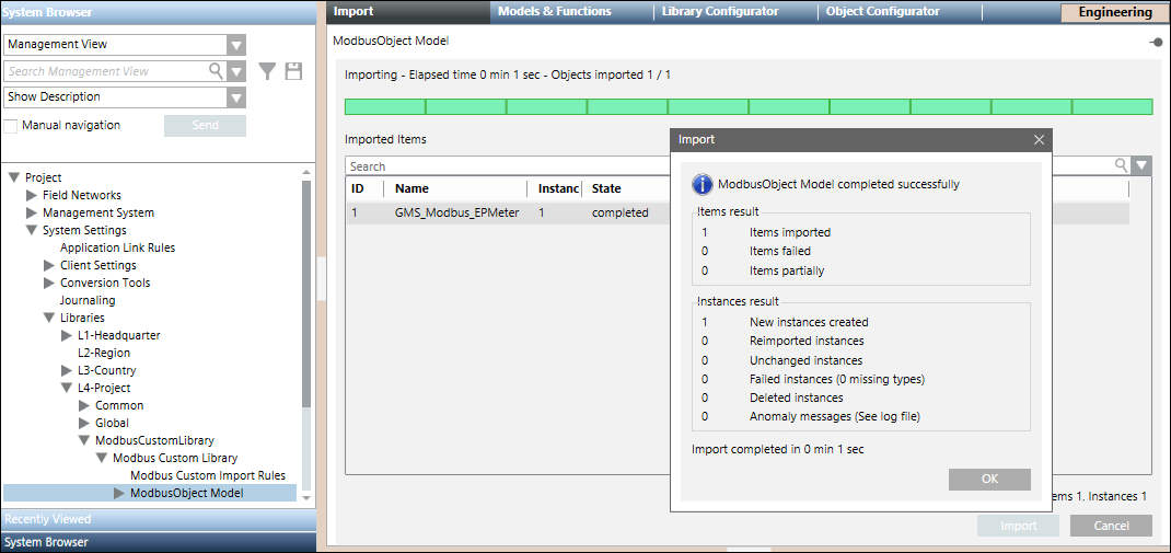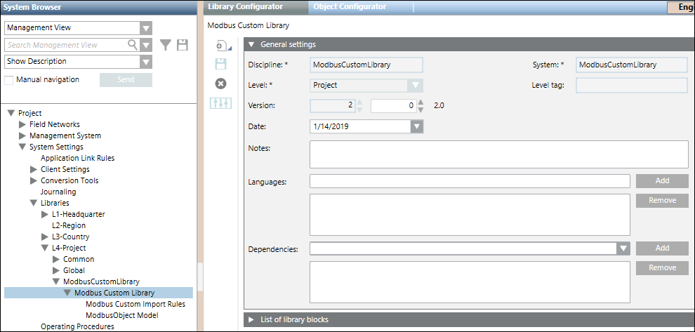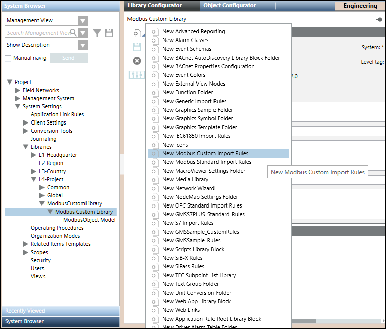 Create an object model folder in it by selecting New Object Model Folder menu option in the list that displays on clicking Add new object. Also, create an import rules folder by selecting the New Modbus Custom Import Rules menu option. For information, see Adding Blocks to a Library.