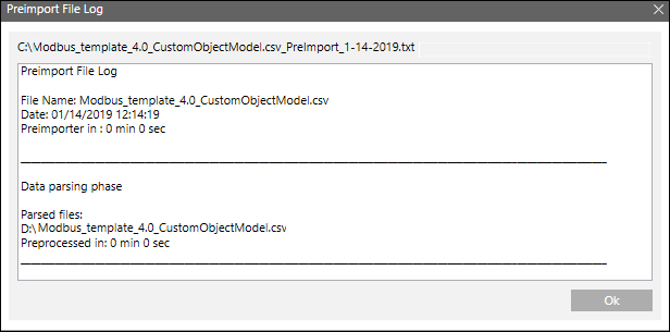 The CSV file is pre-processed and validated. If the file is valid and has all the required parameters, the entries in the file are listed in the Source Items list. In case of any discrepancies, an error message displays in the Preimport File Log dialog box. You can access this dialog box by clicking the Analysis Log button This button is only enabled when the pre-processing is complete.