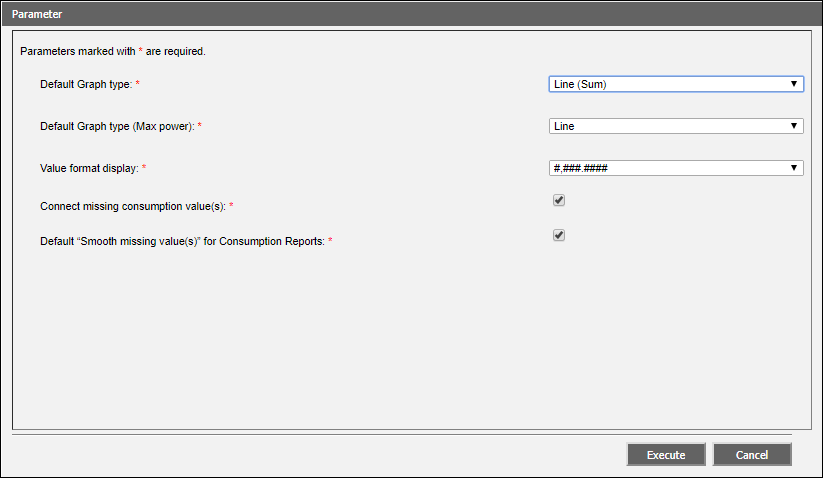 You can connect and smooth these missing values using the Connect missing consumption value(s) checkbox in the Parameter dialog box accessed by clicking Edit next to Energy Reports Settings on the Configuration Page and Smooth missing value(s) check box in the Parameter dialog box accessed on executing a consumption report. For information on executing a report, see Executing Energy Reports.