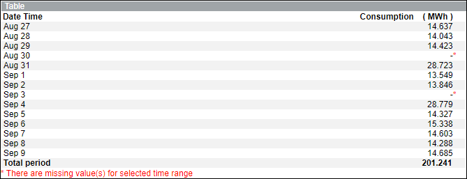 - Displays a blank consumption value with a red asterisk (*) for a missing date.