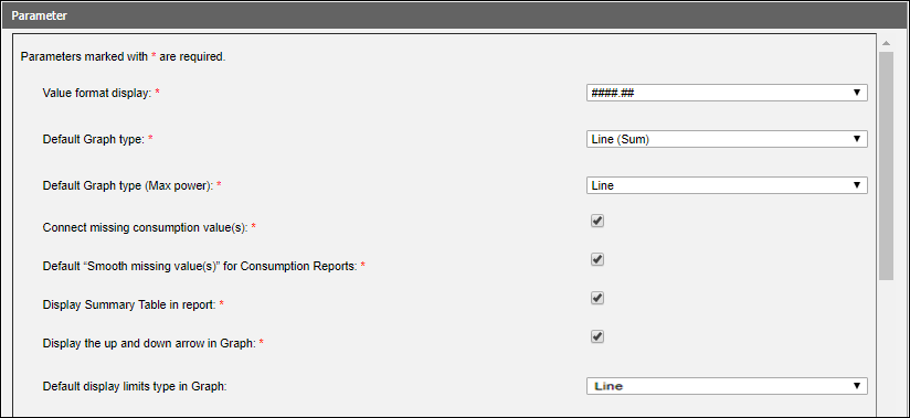 Default Graph Type (Max Power) | Line | Applicable only if you are executing the Consumption and Max Power report. |