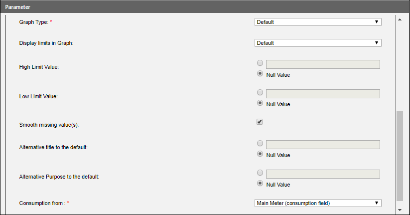 You execute a Consumption report by selecting an aggregator node (for example, Floor1) in the System Browser. In the Parameter dialog box, you select the Null Value option for High Limit Value and Low Limit Value fields. Retain the Default value in Display limits in Graph. You can change the value to Range if you want the limit lines to display as a range.