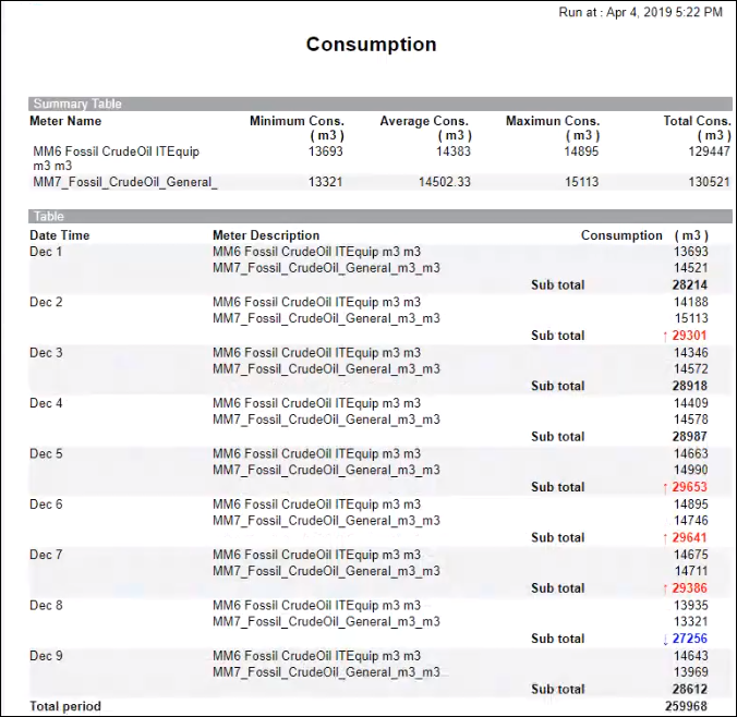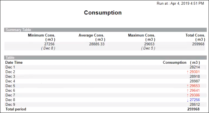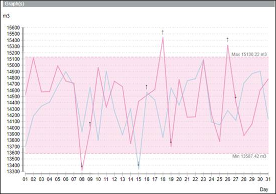 Consumption values that are above the maximum limit line are represented by a red arrow and values below the minimum limit line are represented by a blue arrow in the report table.