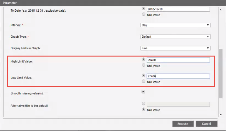 As the values for high limit and low limit are directly entered in the Parameter dialog box, the limit lines will directly be displayed on the graph on executing the report and not on the basis of the formulas as in Example 1.