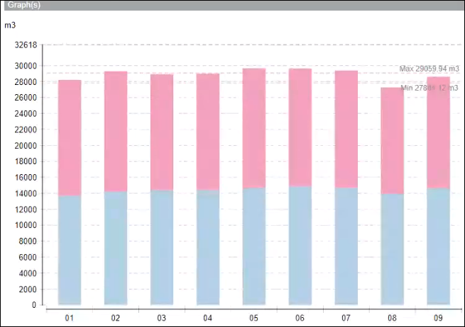 As the percentage of the difference between the minimum and maximum consumption values is less than 25% of the average value, 2% will be added to the minimum consumption value and displayed as the minimum limit line (27801.12) and 2% will be deducted from the maximum consumption value and displayed as the maximum limit line (29059.94).