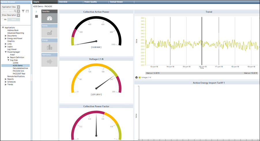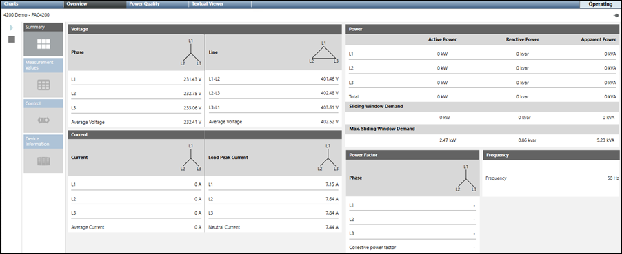 - Monitor that relevant values display in the Voltage, Power, Current, Power Factor, and Frequency sections.