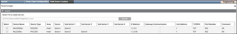 - A success message displays on successful creation of the devices.The selected devices are created and displayed in the System Browser tree according to the structure defined in the CSV file.